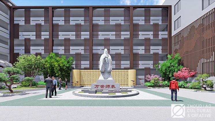 折叠有秩的经折墙上,刻下校长所创的《孔子赋赞》,总述孔子生平,也彰显校园钻研儒学,探究孔子、传承中华传统文化的研学风尚。孔子的一生经历、思想成就,便在这朗朗上口的文辞中娓娓道来。闲暇之余,师生们在广场上,顺着经折展开的方向沿道而行,从而知孔子、尊孔子,继承孔子哲思与德修。