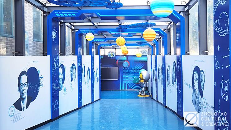 天空蓝与科技白构成主入口的基调,步入其中,仰望是宇宙星空。高低错落的星球挂饰增加层次感,将空间丰富。伴着层层递进的科技门框与太空简笔画,让思维逐渐沉浸,沿道而行,那些极具影响力的科技人物一一在眼前留下影像。