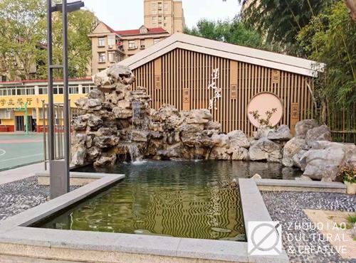 为了凸显学校原有的园林式校园的特色,我们对原本的园林景石组景进行了形象升格。加入了水的元素,与已有的山石、林木相映衬,形成墨池翠影的校园一景,尽显幽雅之美。