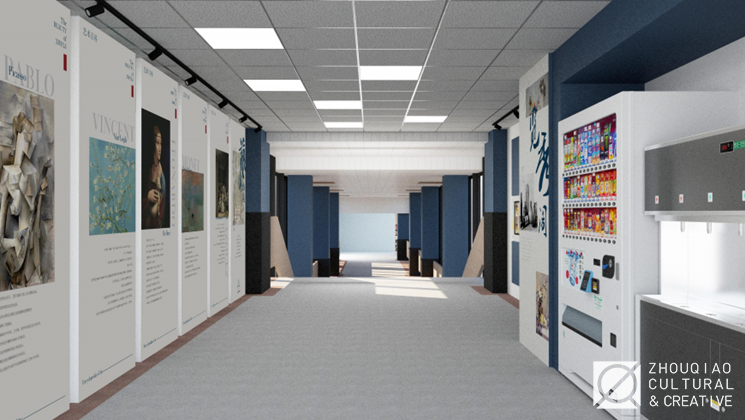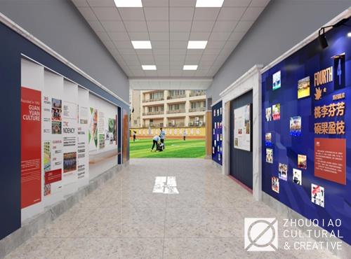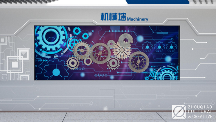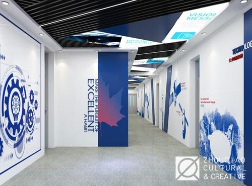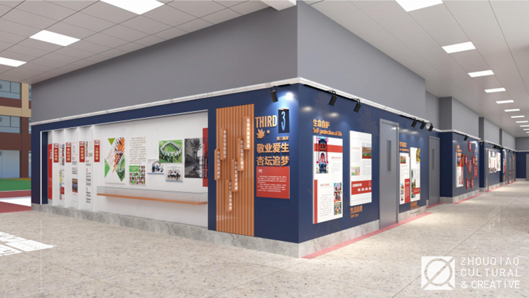 而科技长廊与物理长廊整体选用了严谨并具有科学理性特点的蓝色进行设计。当学生走进物理长廊,嫦娥工程、中国空间站、祖冲之号量子计算机、福建舰等中国最新的物理研究成果一一展现在眼前。