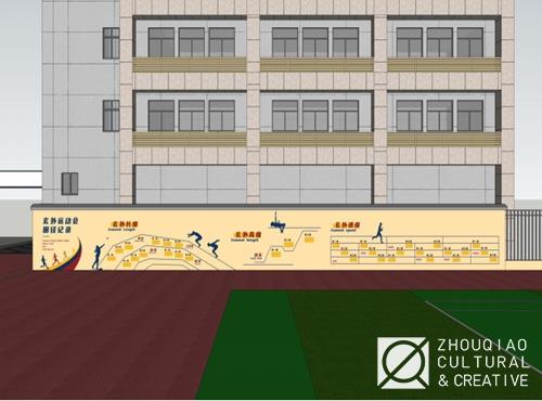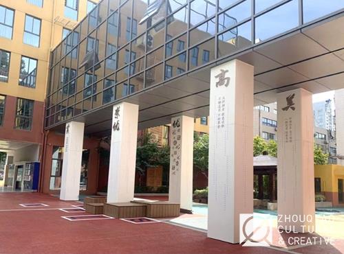 连廊伴随着学生们的课间时光,因此我们根据教学功能为它们设计对应的文化展示。一楼连廊,在立柱上展示“优”“美”“实”“高”等优秀的品质、习惯和目标,引导学生形成提升自我的意识。