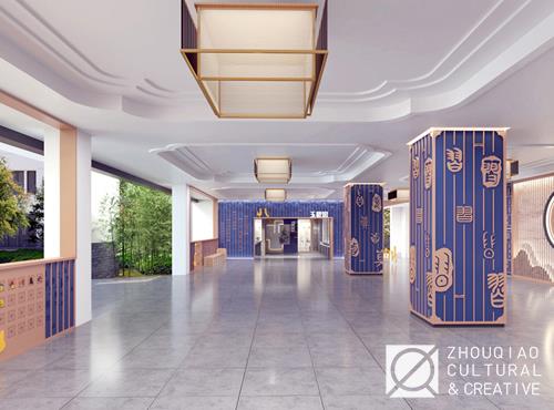追溯学校文化之源,以线装书蓝铺设出沉稳踏实的环境,加以形式多样的“真”字的印记,让求真的精神意识印刻在孩子们心中,引导着师生践行三风,在求真中求进。将古籍的结构融入设计,将文化的意韵融入环境,一柱一墙都如同浸润着知识的古典书籍,带着传统文化的积淀感,为学生们呈现求真知、学真才的氛围。
