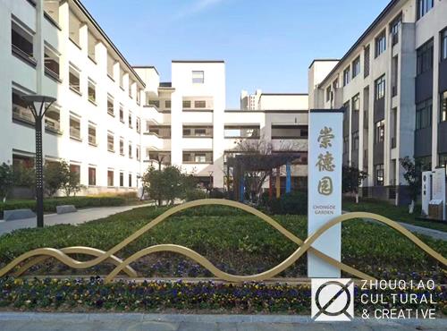 以古人为鉴,明德崇德,践真言真行做真人,塑真诚真信的真品格。以山比德,山脉的起伏剪影象征孔子“仁者乐山”之说。在长廊格柵中嵌入孔子、孟子、荀子、董仲舒等儒学大家的生平,景墙上呈现品德典故。师生行走在园内,回廊漫步,了解圣人、熏陶德行,传承中华传统美德。
