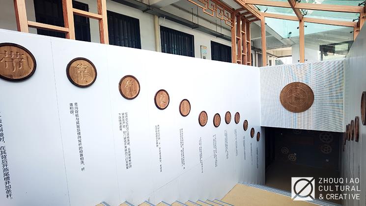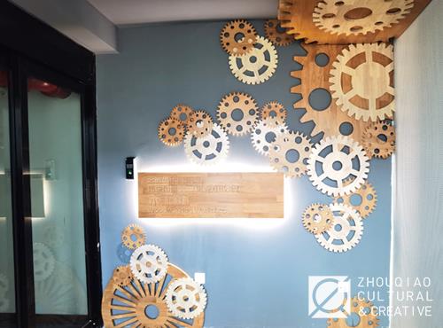 台阶之下的主题墙面上,刨刀、锉刀、量具……木工工具通过线绘一一展示,学生的灵感借助工具,可以打磨出无限的创造可能。齿轮元素在这里以木制的形式展示,质朴的木色下,是传统工艺和机巧匠心的显露。
