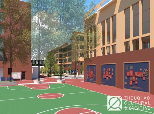 连廊伴随着学生们的课间时光,因此我们根据教学功能为它们设计对应的文化展示。一楼连廊,在立柱上展示“优”“美”“实”“高”等优秀的品质、习惯和目标,引导学生形成提升自我的意识。