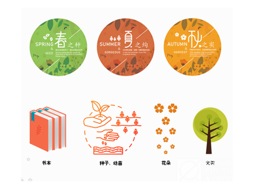 大厅的文化内容,对应花木的生长状态从而整体规划出“春之种”“夏之绚”“秋之实”的逻辑主线。顺着这条主线,我们可以看到学校从最初创建、文化萌发,到致力建设、发展积淀,再到创新开拓、收获成果的一步步成长之路。